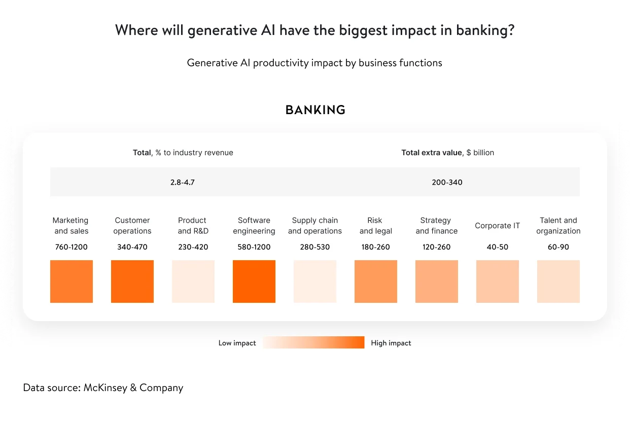 AI technology is set to benefit various business functions of banking. Experts predict that generative AI, in particular, could bring in an additional $200 billion to $340 billion in revenue and cost savings each year for banks, adding from 2.8 to 4.7 percent to the industry’s annual revenue: