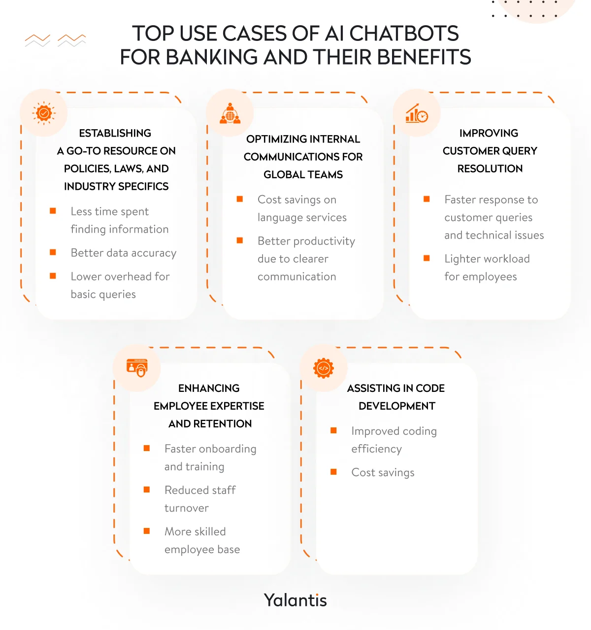 To achieve immediate business efficiency and cost savings when implementing a chatbot in banking, it’s best to start with internal use cases. This allows you to experiment, refine the chatbot technology, and pave the way for more complex use cases in the future.