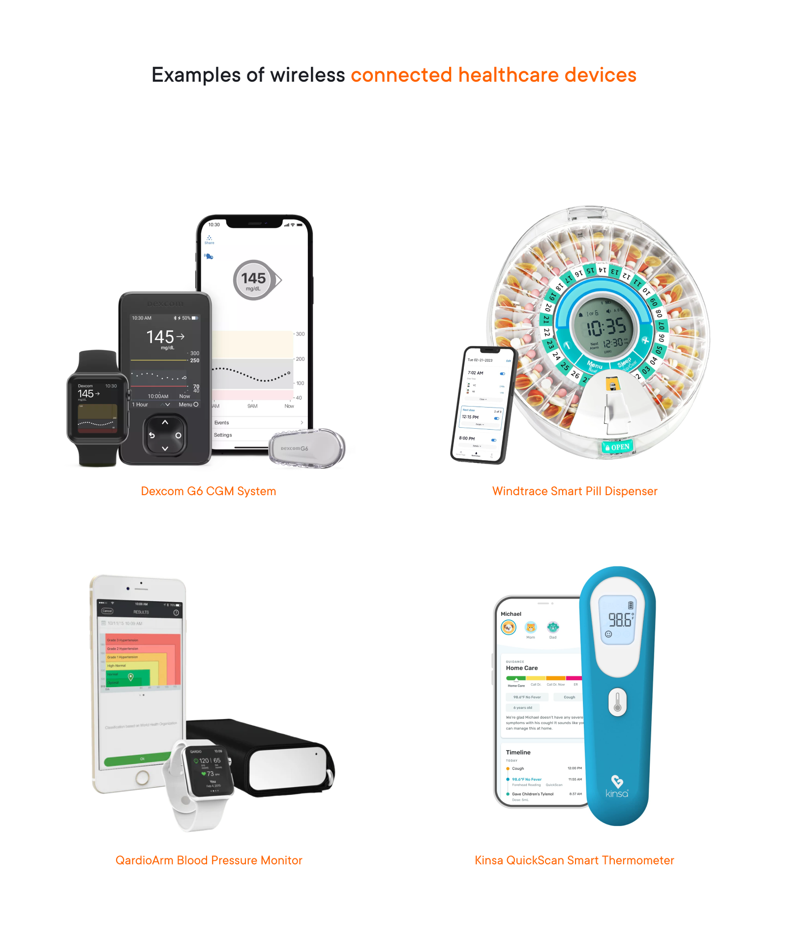 - Wireless glucometers. Traditionally, managing diabetes involved finger pricks and manual blood sugar readings. Connected glucometers, like the Dexcom G6, are changing the game. These connected medical devices measure blood sugar levels continuously and transmit the data wirelessly to a smartphone app, eliminating the need for constant finger pricks and providing real-time data for better diabetes management.