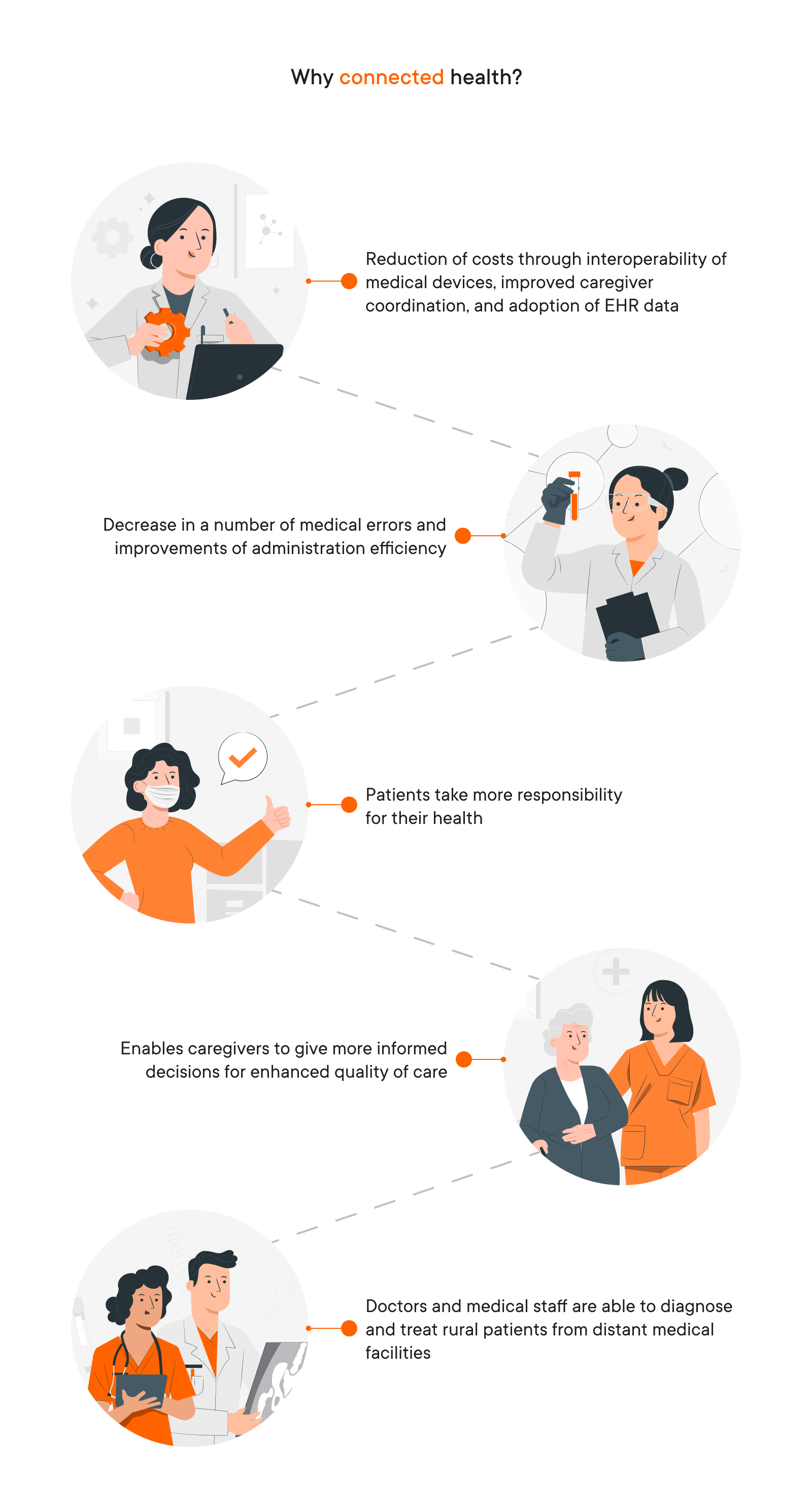 CONNECTED HEALTH CARE is a comprehensive approach to healthcare delivery that integrates various digital technologies (wearable devices, Internet of Things solutions(IoT), telemedicine platforms, EHRs, mobile health apps, and others) to improve patient care and streamline communication among healthcare providers, patients, and other stakeholders. Connected health technology as well as connected health solutions aim to enhance the quality, accessibility, and efficiency of healthcare services while improving patient outcomes.