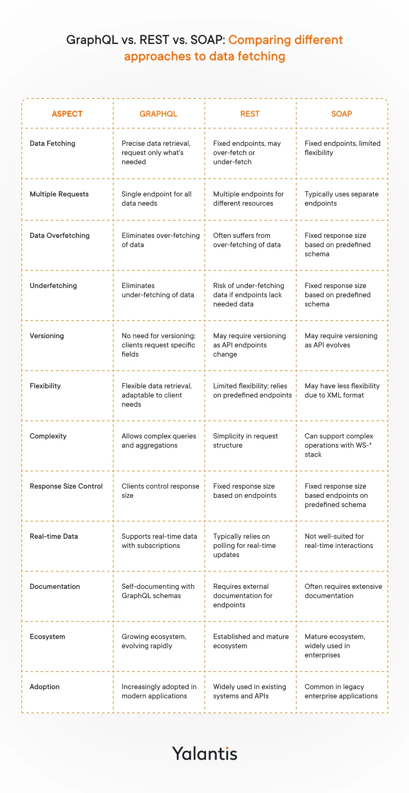Along with React query management and GraphQL API, we have the Representational State Transfer (REST) architecture and Simple Object Access Protocol (SOAP). While REST and SOAP are prevalent in web apps, they have limitations when it comes to fetching data for modern applications, including financial apps. They often result in over-fetching or under-fetching of data due to rigid endpoints, necessitating versioning as APIs evolve. Additionally, they typically lack real-time capabilities, relying on polling for updates.