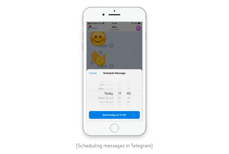 Messaging apps. On Telegram, for instance, users can send scheduled messages by holding the Send button in a chat and choosing Schedule Message. The message will then be sent automatically at the specified time. Telegram users can use their Saved Messages chat to turn planned messages into reminders.