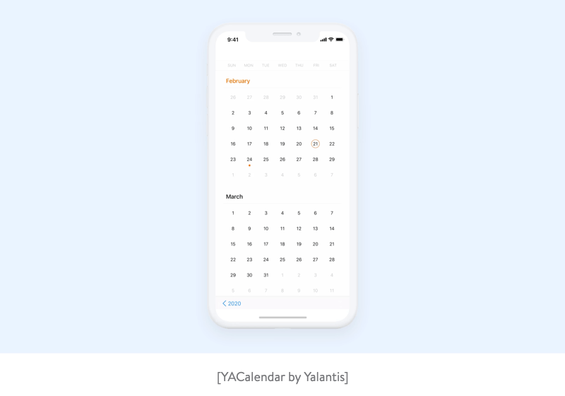 Recently, we released the YACalendar library for iOS. It’s a customizable calendar for native iOS calendar app development that offers year and month views with horizontal and vertical scrolling. This library is optimized for iPhone screens from the iPhone 5 to iPhone 11. You can enjoy the following features: