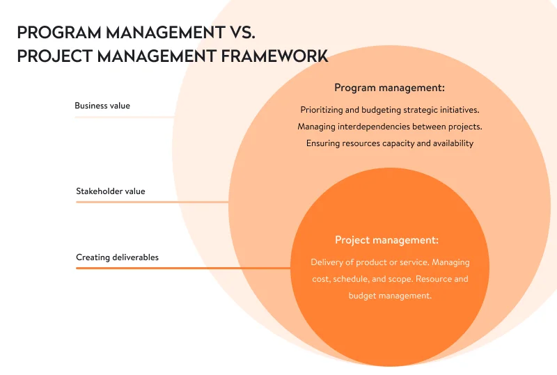 The program management framework does not exclude the project management framework but rather complements it. However, program management consolidates all components and has additional tools and mechanisms that allow you to keep and manage multiple projects as one entity.