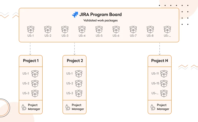 Once the program scope has been defined, a program manager, together with a business analyst and a solution architect, can efficiently distribute the entire scope of work across program streams.