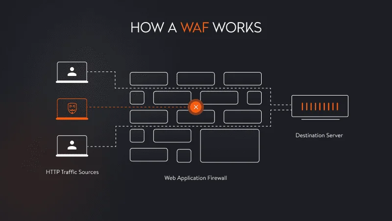 A web application firewall, or WAF, monitors and filters malicious traffic and protects the application from DDoS attacks, bot traffic, cross-site forgery, cross-site-scripting (XSS), file inclusion, SQL injection, and other types of attacks.