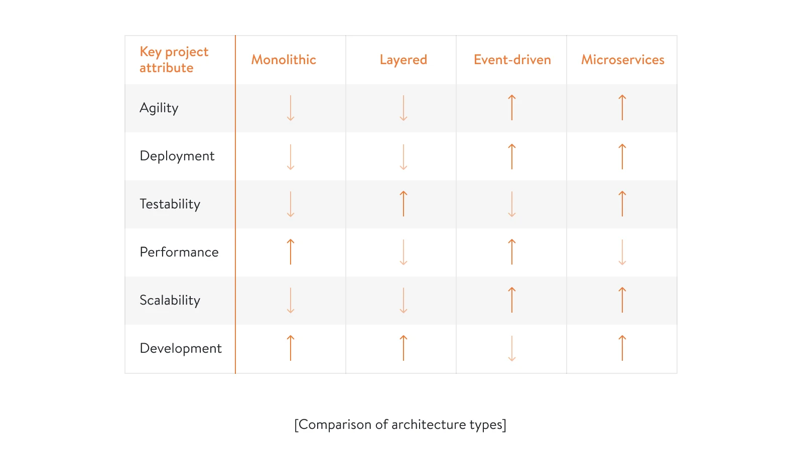 In this article, we’ve compiled key characteristics of the most common architecture types to help you decide which will best fit your project. Below, you can check out a table that compares these software architecture patterns based on a high (↑) or low (↓) degree of the most common project attributes.