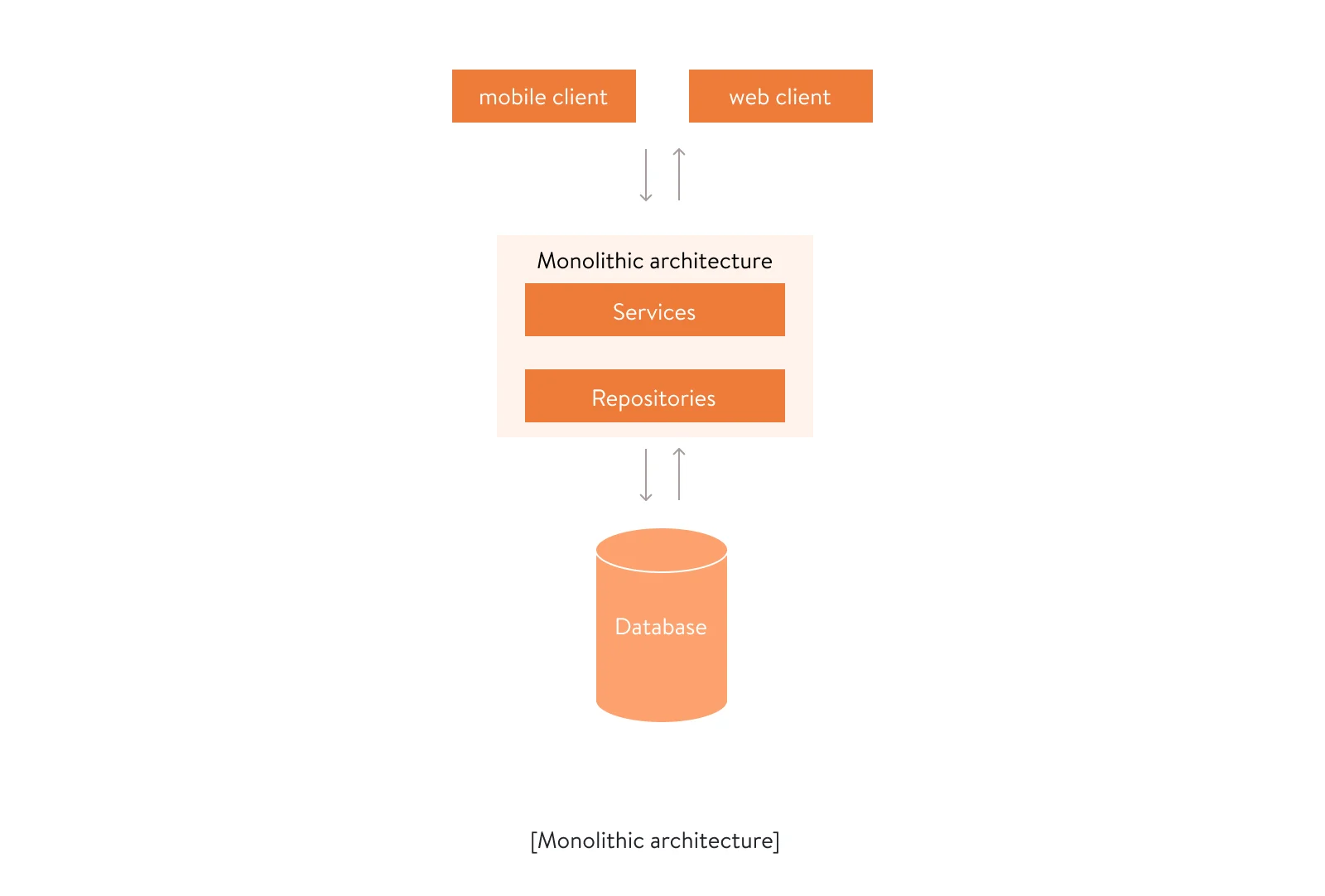 This architectural pattern is one of the most inconvenient in terms of many attributes, especially maintainability, scalability, and flexibility. In a monolithic architecture, all software components are combined into a single codebase.